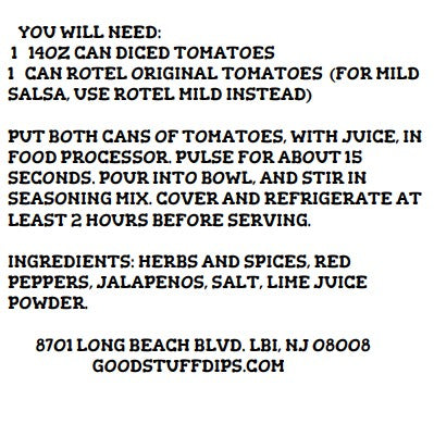 MAKE YOUR OWN HOMEMADE SALSA. JUST COMBINE 1 PACK OF SALSA MIX WITH 1 CAN OF DICED TOMATOES AND 1 CAN OF ROTEL TOMATOES WITH CHILIS