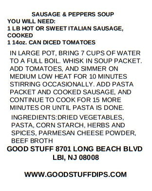Now you can enjoy your favorite Italian sandwich as a Soup. Just add water, cooked sausage, and a can of tomato sauce, and in 20 minutes have 2 quarts of delicious homemade soup.