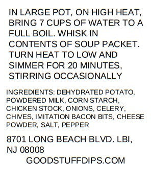 Delicious, homemade tasting soup was never so easy. Just add water and simmer for 15 minutes for a great tasting soup with all the flavors of a loaded baked potato. Makes around 2 quarts.