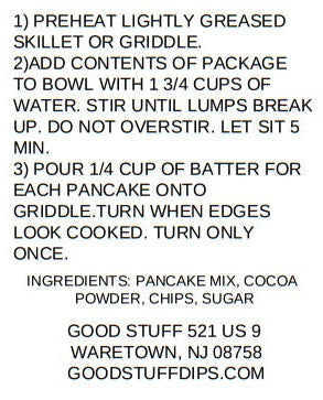 Just add water to make 12 fluffy 4" chocolate pancakes filled with chocolate chips.